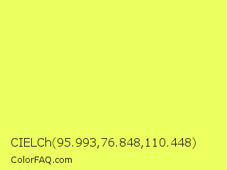 CIELCh 95.993,76.848,110.448 Color is a light yellow color and the nearest color is Canary #f3fb62. Hex code #ebff5e and RGB value is rgb(235,255,94). In RGB color space, this color is composed of 92% red, 100% green, 37% blue, In CMYK color space, this color is composed of 8% cyan, 0% magenta, 63% yellow , 0% black , In HSL color space, this color has a hue angle of 67° , 100% saturation and 68% lightness.