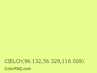 CIELCh 96.132,56.329,116.009 Color is a light lime color and the nearest color is Mindaro #e3f988. Hex code #e6ff8f and RGB value is rgb(230,255,143). In RGB color space, this color is composed of 90% red, 100% green, 56% blue, In CMYK color space, this color is composed of 10% cyan, 0% magenta, 44% yellow , 0% black , In HSL color space, this color has a hue angle of 73° , 100% saturation and 78% lightness.
