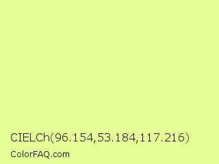 CIELCh 96.154,53.184,117.216 Color is a light lime color and the nearest color is Jonquil #eeff9a. Hex code #e5ff96 and RGB value is rgb(229,255,150). In RGB color space, this color is composed of 90% red, 100% green, 59% blue, In CMYK color space, this color is composed of 10% cyan, 0% magenta, 41% yellow , 0% black , In HSL color space, this color has a hue angle of 75° , 100% saturation and 79% lightness.