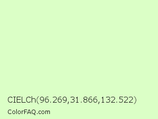 CIELCh 96.269,31.866,132.522 Color is a very light green color and the nearest color is Snow Flurry #e4ffd1. Hex code #dbffc6 and RGB value is rgb(219,255,198). In RGB color space, this color is composed of 86% red, 100% green, 78% blue, In CMYK color space, this color is composed of 14% cyan, 0% magenta, 22% yellow , 0% black , In HSL color space, this color has a hue angle of 98° , 100% saturation and 89% lightness.