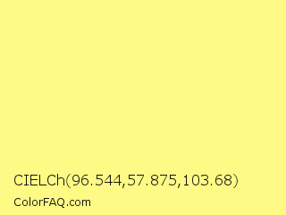 CIELCh 96.544,57.875,103.68 Color is a light yellow color and the nearest color is Dolly #f9ff8b. Hex code #fffa85 and RGB value is rgb(255,250,133). In RGB color space, this color is composed of 100% red, 98% green, 52% blue, In CMYK color space, this color is composed of 0% cyan, 2% magenta, 48% yellow , 0% black , In HSL color space, this color has a hue angle of 58° , 100% saturation and 76% lightness.
