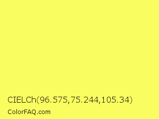 CIELCh 96.575,75.244,105.34 Color is a light yellow color and the nearest color is Icterine #fcf75e. Hex code #fafd5f and RGB value is rgb(250,253,95). In RGB color space, this color is composed of 98% red, 99% green, 37% blue, In CMYK color space, this color is composed of 1% cyan, 0% magenta, 62% yellow , 1% black , In HSL color space, this color has a hue angle of 61° , 98% saturation and 68% lightness.