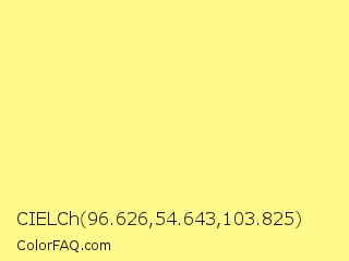CIELCh 96.626,54.643,103.825 Color is a light yellow color and the nearest color is Dolly #f9ff8b. Hex code #fffa8c and RGB value is rgb(255,250,140). In RGB color space, this color is composed of 100% red, 98% green, 55% blue, In CMYK color space, this color is composed of 0% cyan, 2% magenta, 45% yellow , 0% black , In HSL color space, this color has a hue angle of 57° , 100% saturation and 77% lightness.