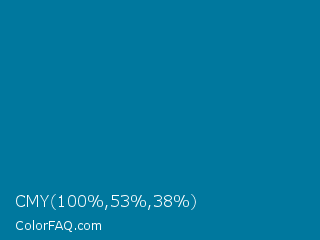 CMY 100,53,38 Color is a normal blue color and the nearest color is Allports #0076a3. Hex code #00789e and RGB value is rgb(0,120,158). In RGB color space, this color is composed of 0% red, 47% green, 62% blue, In CMYK color space, this color is composed of 100% cyan, 24% magenta, 0% yellow , 38% black , In HSL color space, this color has a hue angle of 194° , 100% saturation and 31% lightness.