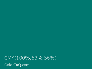 CMY 100,53,56 Color is a dark cyan color and the nearest color is Pine Green #01796f. Hex code #007870 and RGB value is rgb(0,120,112). In RGB color space, this color is composed of 0% red, 47% green, 44% blue, In CMYK color space, this color is composed of 100% cyan, 0% magenta, 7% yellow , 53% black , In HSL color space, this color has a hue angle of 176° , 100% saturation and 24% lightness.