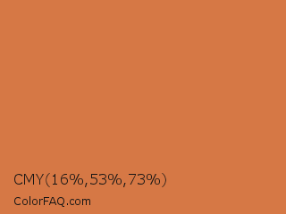 CMY 16,53,73 Color is a normal orange color and the nearest color is Raw Sienna Crayola #d27d46. Hex code #d67845 and RGB value is rgb(214,120,69). In RGB color space, this color is composed of 84% red, 47% green, 27% blue, In CMYK color space, this color is composed of 0% cyan, 44% magenta, 68% yellow , 16% black , In HSL color space, this color has a hue angle of 21° , 64% saturation and 55% lightness.