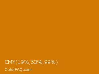 CMY 19,53,99 Color is a normal orange color and the nearest color is Meteor #d07d12. Hex code #cf7803 and RGB value is rgb(207,120,3). In RGB color space, this color is composed of 81% red, 47% green, 1% blue, In CMYK color space, this color is composed of 0% cyan, 42% magenta, 99% yellow , 19% black , In HSL color space, this color has a hue angle of 34° , 97% saturation and 41% lightness.