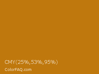 CMY 25,53,95 Color is a normal orange color and the nearest color is Pirate Gold #ba7f03. Hex code #bf780d and RGB value is rgb(191,120,13). In RGB color space, this color is composed of 75% red, 47% green, 5% blue, In CMYK color space, this color is composed of 0% cyan, 37% magenta, 93% yellow , 25% black , In HSL color space, this color has a hue angle of 36° , 87% saturation and 40% lightness.
