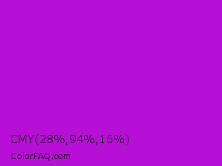 CMY 28,94,16 Color is a normal purple color and the nearest color is Vivid Mulberry #b80ce3. Hex code #b80fd6 and RGB value is rgb(184,15,214). In RGB color space, this color is composed of 72% red, 6% green, 84% blue, In CMYK color space, this color is composed of 14% cyan, 93% magenta, 0% yellow , 16% black , In HSL color space, this color has a hue angle of 291° , 87% saturation and 45% lightness.