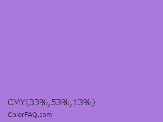 CMY 33,53,13 Color is a light violet color and the nearest color is Lavender #b57edc. Hex code #ab78de and RGB value is rgb(171,120,222). In RGB color space, this color is composed of 67% red, 47% green, 87% blue, In CMYK color space, this color is composed of 23% cyan, 46% magenta, 0% yellow , 13% black , In HSL color space, this color has a hue angle of 270° , 61% saturation and 67% lightness.