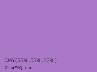 CMY 33,53,22 Color is a light purple color and the nearest color is Rich Lavender #a76bcf. Hex code #ab78c7 and RGB value is rgb(171,120,199). In RGB color space, this color is composed of 67% red, 47% green, 78% blue, In CMYK color space, this color is composed of 14% cyan, 40% magenta, 0% yellow , 22% black , In HSL color space, this color has a hue angle of 279° , 41% saturation and 63% lightness.