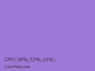 CMY 38,53,16 Color is a light violet color and the nearest color is Lilac Bush #9874d3. Hex code #9e78d6 and RGB value is rgb(158,120,214). In RGB color space, this color is composed of 62% red, 47% green, 84% blue, In CMYK color space, this color is composed of 26% cyan, 44% magenta, 0% yellow , 16% black , In HSL color space, this color has a hue angle of 264° , 53% saturation and 65% lightness.