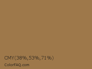 CMY 38,53,71 Color is a normal orange color and the nearest color is Dirt #9b7653. Hex code #9e784a and RGB value is rgb(158,120,74). In RGB color space, this color is composed of 62% red, 47% green, 29% blue, In CMYK color space, this color is composed of 0% cyan, 24% magenta, 53% yellow , 38% black , In HSL color space, this color has a hue angle of 33° , 36% saturation and 45% lightness.