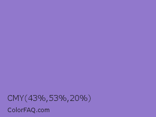 CMY 43,53,20 Color is a light indigo color and the nearest color is Lilac Bush #9874d3. Hex code #9178cc and RGB value is rgb(145,120,204). In RGB color space, this color is composed of 57% red, 47% green, 80% blue, In CMYK color space, this color is composed of 29% cyan, 41% magenta, 0% yellow , 20% black , In HSL color space, this color has a hue angle of 258° , 45% saturation and 64% lightness.