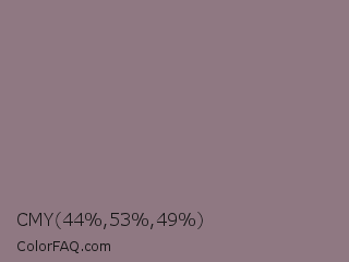 CMY 44,53,49 Color is a normal rose color and the nearest color is Rocket Metallic #8a7f80. Hex code #8f7882 and RGB value is rgb(143,120,130). In RGB color space, this color is composed of 56% red, 47% green, 51% blue, In CMYK color space, this color is composed of 0% cyan, 16% magenta, 9% yellow , 44% black , In HSL color space, this color has a hue angle of 334° , 9% saturation and 52% lightness.