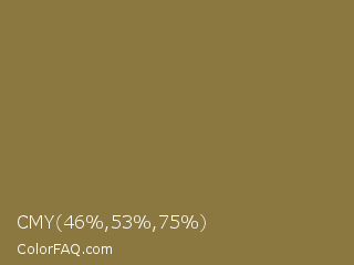 CMY 46,53,75 Color is a normal orange color and the nearest color is Old Moss Green #867e36. Hex code #8a7840 and RGB value is rgb(138,120,64). In RGB color space, this color is composed of 54% red, 47% green, 25% blue, In CMYK color space, this color is composed of 0% cyan, 13% magenta, 54% yellow , 46% black , In HSL color space, this color has a hue angle of 45° , 37% saturation and 40% lightness.