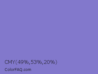 CMY 49,53,20 Color is a light indigo color and the nearest color is Moody Blue #7f76d3. Hex code #8278cc and RGB value is rgb(130,120,204). In RGB color space, this color is composed of 51% red, 47% green, 80% blue, In CMYK color space, this color is composed of 36% cyan, 41% magenta, 0% yellow , 20% black , In HSL color space, this color has a hue angle of 247° , 45% saturation and 64% lightness.