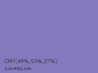CMY 49,53,27 Color is a normal indigo color and the nearest color is Ube #8878c3. Hex code #8278ba and RGB value is rgb(130,120,186). In RGB color space, this color is composed of 51% red, 47% green, 73% blue, In CMYK color space, this color is composed of 30% cyan, 35% magenta, 0% yellow , 27% black , In HSL color space, this color has a hue angle of 249° , 32% saturation and 60% lightness.