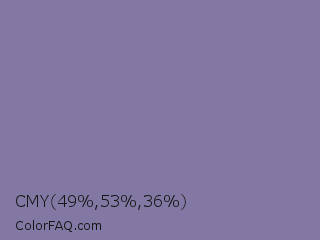 CMY 49,53,36 Color is a normal indigo color and the nearest color is Waterloo #7b7c94. Hex code #8278a3 and RGB value is rgb(130,120,163). In RGB color space, this color is composed of 51% red, 47% green, 64% blue, In CMYK color space, this color is composed of 20% cyan, 26% magenta, 0% yellow , 36% black , In HSL color space, this color has a hue angle of 254° , 19% saturation and 55% lightness.