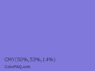 CMY 50,53,14 Color is a light indigo color and the nearest color is Moody Blue #7f76d3. Hex code #8078db and RGB value is rgb(128,120,219). In RGB color space, this color is composed of 50% red, 47% green, 86% blue, In CMYK color space, this color is composed of 42% cyan, 45% magenta, 0% yellow , 14% black , In HSL color space, this color has a hue angle of 245° , 58% saturation and 66% lightness.