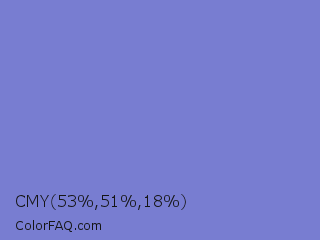 CMY 53,51,18 Color is a light blue color and the nearest color is Moody Blue #7f76d3. Hex code #787dd1 and RGB value is rgb(120,125,209). In RGB color space, this color is composed of 47% red, 49% green, 82% blue, In CMYK color space, this color is composed of 43% cyan, 40% magenta, 0% yellow , 18% black , In HSL color space, this color has a hue angle of 237° , 49% saturation and 65% lightness.