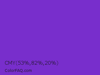 CMY 53,82,20 Color is a normal violet color and the nearest color is Purple Heart Crayola #652dc1. Hex code #782ecc and RGB value is rgb(120,46,204). In RGB color space, this color is composed of 47% red, 18% green, 80% blue, In CMYK color space, this color is composed of 41% cyan, 77% magenta, 0% yellow , 20% black , In HSL color space, this color has a hue angle of 268° , 63% saturation and 49% lightness.