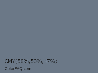 CMY 58,53,47 Color is a normal blue color and the nearest color is Pale Sky #6e7783. Hex code #6b7887 and RGB value is rgb(107,120,135). In RGB color space, this color is composed of 42% red, 47% green, 53% blue, In CMYK color space, this color is composed of 21% cyan, 11% magenta, 0% yellow , 47% black , In HSL color space, this color has a hue angle of 212° , 12% saturation and 47% lightness.