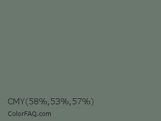 CMY 58,53,57 Color is a normal green color and the nearest color is Nickel #727472. Hex code #6b786e and RGB value is rgb(107,120,110). In RGB color space, this color is composed of 42% red, 47% green, 43% blue, In CMYK color space, this color is composed of 11% cyan, 0% magenta, 8% yellow , 53% black , In HSL color space, this color has a hue angle of 134° , 6% saturation and 45% lightness.