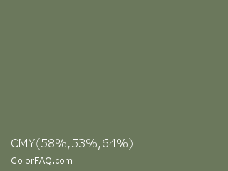 CMY 58,53,64 Color is a normal green color and the nearest color is Willow Grove #65745d. Hex code #6b785c and RGB value is rgb(107,120,92). In RGB color space, this color is composed of 42% red, 47% green, 36% blue, In CMYK color space, this color is composed of 11% cyan, 0% magenta, 23% yellow , 53% black , In HSL color space, this color has a hue angle of 88° , 13% saturation and 42% lightness.