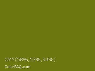 CMY 58,53,94 Color is a dark yellow color and the nearest color is Olivetone #716e10. Hex code #6b780f and RGB value is rgb(107,120,15). In RGB color space, this color is composed of 42% red, 47% green, 6% blue, In CMYK color space, this color is composed of 11% cyan, 0% magenta, 88% yellow , 53% black , In HSL color space, this color has a hue angle of 67° , 78% saturation and 26% lightness.