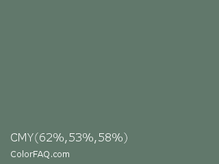 CMY 62,53,58 Color is a normal green color and the nearest color is Corduroy #606e68. Hex code #61786b and RGB value is rgb(97,120,107). In RGB color space, this color is composed of 38% red, 47% green, 42% blue, In CMYK color space, this color is composed of 19% cyan, 0% magenta, 11% yellow , 53% black , In HSL color space, this color has a hue angle of 146° , 11% saturation and 43% lightness.