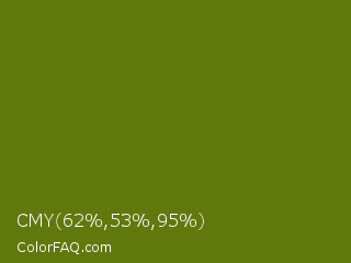CMY 62,53,95 Color is a dark lime color and the nearest color is Avocado #568203. Hex code #61780d and RGB value is rgb(97,120,13). In RGB color space, this color is composed of 38% red, 47% green, 5% blue, In CMYK color space, this color is composed of 19% cyan, 0% magenta, 89% yellow , 53% black , In HSL color space, this color has a hue angle of 73° , 80% saturation and 26% lightness.