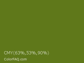CMY 63,53,90 Color is a dark lime color and the nearest color is Fern Frond #657220. Hex code #5e781a and RGB value is rgb(94,120,26). In RGB color space, this color is composed of 37% red, 47% green, 10% blue, In CMYK color space, this color is composed of 22% cyan, 0% magenta, 78% yellow , 53% black , In HSL color space, this color has a hue angle of 77° , 64% saturation and 29% lightness.