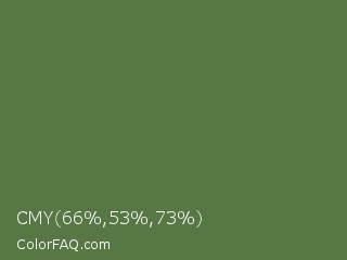 CMY 66,53,73 Color is a normal green color and the nearest color is Dingley #5d7747. Hex code #577845 and RGB value is rgb(87,120,69). In RGB color space, this color is composed of 34% red, 47% green, 27% blue, In CMYK color space, this color is composed of 28% cyan, 0% magenta, 43% yellow , 53% black , In HSL color space, this color has a hue angle of 99° , 27% saturation and 37% lightness.