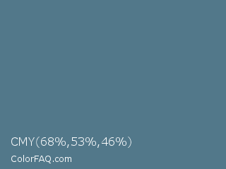 CMY 68,53,46 Color is a normal blue color and the nearest color is Smalt Blue #51808f. Hex code #52788a and RGB value is rgb(82,120,138). In RGB color space, this color is composed of 32% red, 47% green, 54% blue, In CMYK color space, this color is composed of 41% cyan, 13% magenta, 0% yellow , 46% black , In HSL color space, this color has a hue angle of 199° , 25% saturation and 43% lightness.