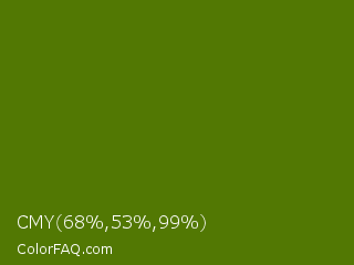 CMY 68,53,99 Color is a dark lime color and the nearest color is Avocado #568203. Hex code #527803 and RGB value is rgb(82,120,3). In RGB color space, this color is composed of 32% red, 47% green, 1% blue, In CMYK color space, this color is composed of 32% cyan, 0% magenta, 98% yellow , 53% black , In HSL color space, this color has a hue angle of 79° , 95% saturation and 24% lightness.