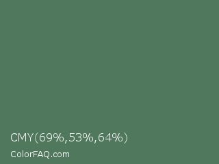 CMY 69,53,64 Color is a normal green color and the nearest color is Como #517c66. Hex code #4f785c and RGB value is rgb(79,120,92). In RGB color space, this color is composed of 31% red, 47% green, 36% blue, In CMYK color space, this color is composed of 34% cyan, 0% magenta, 23% yellow , 53% black , In HSL color space, this color has a hue angle of 139° , 21% saturation and 39% lightness.