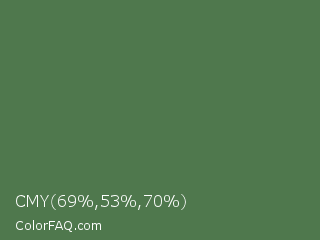 CMY 69,53,70 Color is a normal green color and the nearest color is Hippie Green #53824b. Hex code #4f784d and RGB value is rgb(79,120,77). In RGB color space, this color is composed of 31% red, 47% green, 30% blue, In CMYK color space, this color is composed of 34% cyan, 0% magenta, 36% yellow , 53% black , In HSL color space, this color has a hue angle of 117° , 22% saturation and 39% lightness.