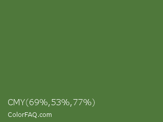 CMY 69,53,77 Color is a normal green color and the nearest color is Fern Green #4f7942. Hex code #4f783b and RGB value is rgb(79,120,59). In RGB color space, this color is composed of 31% red, 47% green, 23% blue, In CMYK color space, this color is composed of 34% cyan, 0% magenta, 51% yellow , 53% black , In HSL color space, this color has a hue angle of 100° , 34% saturation and 35% lightness.