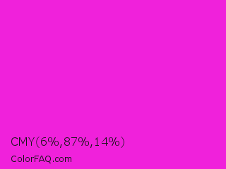 CMY 6,87,14 Color is a normal magenta color and the nearest color is Hot Magenta #ff1dce. Hex code #f021db and RGB value is rgb(240,33,219). In RGB color space, this color is composed of 94% red, 13% green, 86% blue, In CMYK color space, this color is composed of 0% cyan, 86% magenta, 9% yellow , 6% black , In HSL color space, this color has a hue angle of 306° , 87% saturation and 54% lightness.