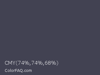 CMY 74,74,68 Color is a dark blue color and the nearest color is Gun Powder #414257. Hex code #424252 and RGB value is rgb(66,66,82). In RGB color space, this color is composed of 26% red, 26% green, 32% blue, In CMYK color space, this color is composed of 20% cyan, 20% magenta, 0% yellow , 68% black , In HSL color space, this color has a hue angle of 240° , 11% saturation and 29% lightness.
