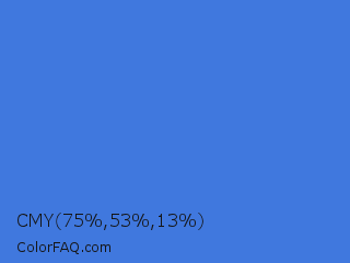 CMY 75,53,13 Color is a normal blue color and the nearest color is Royal Blue #4169e1. Hex code #4078de and RGB value is rgb(64,120,222). In RGB color space, this color is composed of 25% red, 47% green, 87% blue, In CMYK color space, this color is composed of 71% cyan, 46% magenta, 0% yellow , 13% black , In HSL color space, this color has a hue angle of 219° , 71% saturation and 56% lightness.