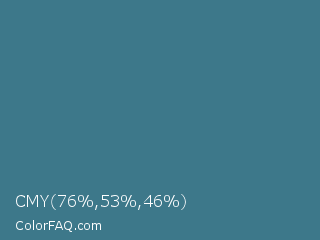 CMY 76,53,46 Color is a normal blue color and the nearest color is Teal Blue #367588. Hex code #3d788a and RGB value is rgb(61,120,138). In RGB color space, this color is composed of 24% red, 47% green, 54% blue, In CMYK color space, this color is composed of 56% cyan, 13% magenta, 0% yellow , 46% black , In HSL color space, this color has a hue angle of 194° , 39% saturation and 39% lightness.