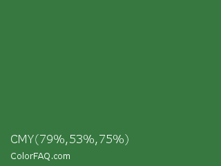 CMY 79,53,75 Color is a normal green color and the nearest color is Killarney #3a6a47. Hex code #367840 and RGB value is rgb(54,120,64). In RGB color space, this color is composed of 21% red, 47% green, 25% blue, In CMYK color space, this color is composed of 55% cyan, 0% magenta, 47% yellow , 53% black , In HSL color space, this color has a hue angle of 129° , 38% saturation and 34% lightness.