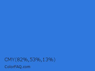 CMY 82,53,13 Color is a normal blue color and the nearest color is Bleu De France #318ce7. Hex code #2e78de and RGB value is rgb(46,120,222). In RGB color space, this color is composed of 18% red, 47% green, 87% blue, In CMYK color space, this color is composed of 79% cyan, 46% magenta, 0% yellow , 13% black , In HSL color space, this color has a hue angle of 215° , 73% saturation and 53% lightness.