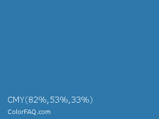 CMY 82,53,33 Color is a normal blue color and the nearest color is Astral #327da0. Hex code #2e78ab and RGB value is rgb(46,120,171). In RGB color space, this color is composed of 18% red, 47% green, 67% blue, In CMYK color space, this color is composed of 73% cyan, 30% magenta, 0% yellow , 33% black , In HSL color space, this color has a hue angle of 204° , 58% saturation and 43% lightness.
