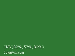 CMY 82,53,80 Color is a normal green color and the nearest color is Mughal Green #306030. Hex code #2e7833 and RGB value is rgb(46,120,51). In RGB color space, this color is composed of 18% red, 47% green, 20% blue, In CMYK color space, this color is composed of 62% cyan, 0% magenta, 58% yellow , 53% black , In HSL color space, this color has a hue angle of 124° , 45% saturation and 33% lightness.