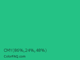 CMY 86,24,48 Color is a normal green color and the nearest color is Mountain Meadow #30ba8f. Hex code #24c285 and RGB value is rgb(36,194,133). In RGB color space, this color is composed of 14% red, 76% green, 52% blue, In CMYK color space, this color is composed of 81% cyan, 0% magenta, 31% yellow , 24% black , In HSL color space, this color has a hue angle of 157° , 69% saturation and 45% lightness.