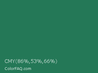 CMY 86,53,66 Color is a normal green color and the nearest color is Eucalyptus #278a5b. Hex code #247857 and RGB value is rgb(36,120,87). In RGB color space, this color is composed of 14% red, 47% green, 34% blue, In CMYK color space, this color is composed of 70% cyan, 0% magenta, 28% yellow , 53% black , In HSL color space, this color has a hue angle of 156° , 54% saturation and 31% lightness.