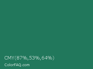 CMY 87,53,64 Color is a dark green color and the nearest color is Eucalyptus #278a5b. Hex code #21785c and RGB value is rgb(33,120,92). In RGB color space, this color is composed of 13% red, 47% green, 36% blue, In CMYK color space, this color is composed of 73% cyan, 0% magenta, 23% yellow , 53% black , In HSL color space, this color has a hue angle of 161° , 57% saturation and 30% lightness.